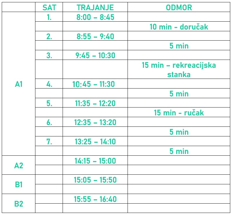 Raspored sati pruža pregled svih nastava i aktivnosti, olakšavajući organizaciju i planiranje školskih obveza.